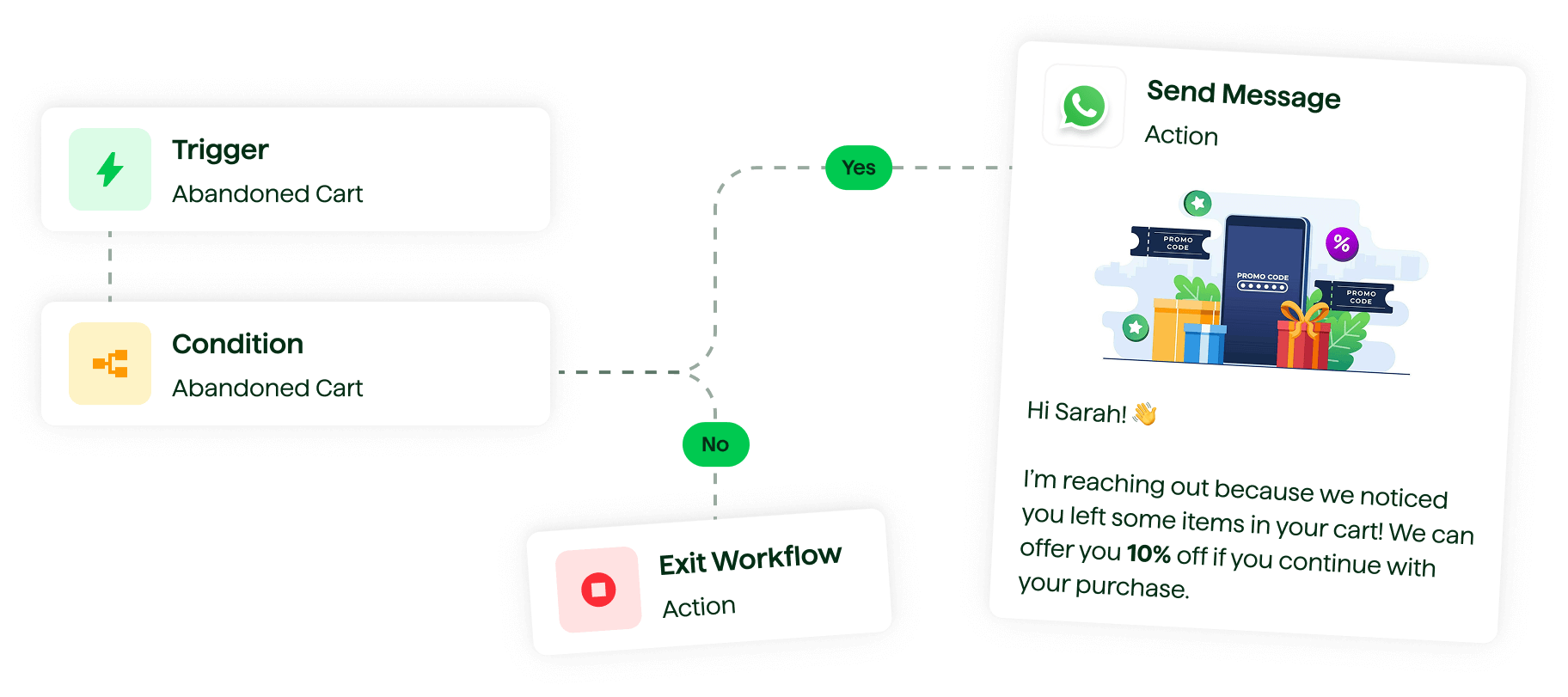 When a customer enters their number at checkout but doesn't complete the purchase, Whatsify detects the event and waits a set amount of time (which you can customize) before sending a pre-set reminder message with a link to restore their cart.